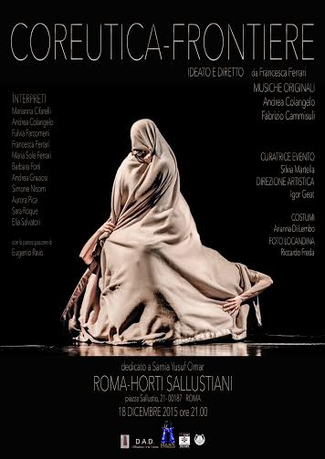 INFO – Coreutica –Frontiere, dedicato a Samia Yusuf Omar. Horti Sallustiani. Con: Marianna Cifarelli, Andrea Colangelo ,Fulvia Farcomeni, Francesca Ferrari, Maria Sole Ferrari, Barbara Forti, Andrea Graziosi, Silvia Martella, Simone Nilson, Aurora Pica, Eugenio Ravo, Sara Roque, Elia Salvatori. Regia: Francesca Ferrari. Musiche Originali: Andrea Colangelo, Fabrizio Cammisuli. Direzione Artistica: Igor Gret